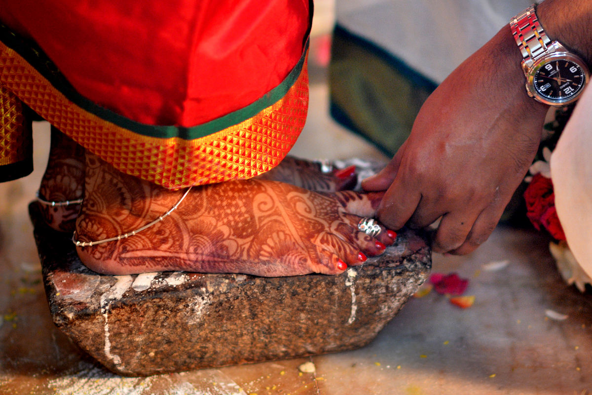 The father of the bride washes the feet of the groom treating him as Lord Mahavishnu.. The mother of the bride applies kajal in the groom’s eye as ritual. During the wedding muhurtham, the hand of the bride is held by the father and given to the groom promising that “With all the beings in this world, with the 5 elements and all celestial beings, I am giving my daughter as a gift to you for the good of your ancestors blessings and the liberation of my ancestors.