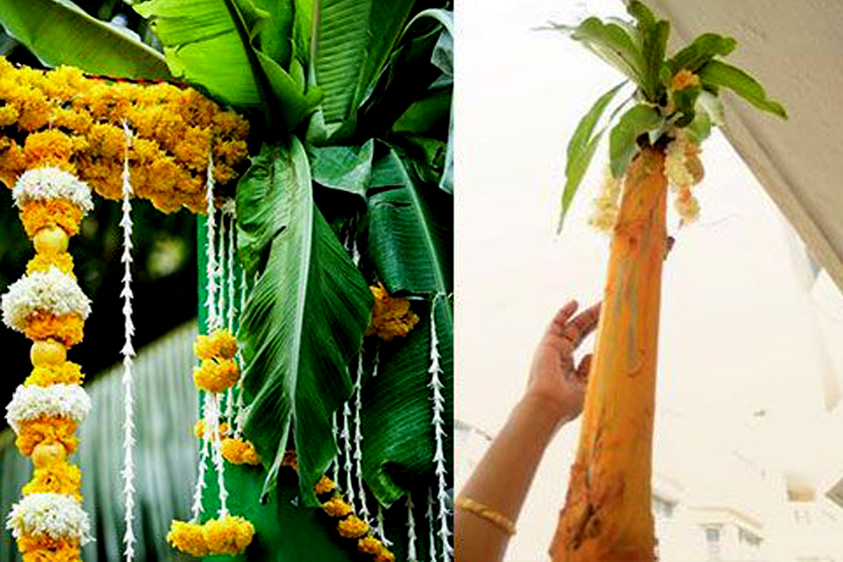 This is the first ritual, where all elderly members of the family gather together and place a tall wooden stick outside the house and raise the banana trees covered with decorations and flowers to symbolically indicate that a wedding is about to happen in that house. This is done mainly in the bride’s house, where she is blessed by elders and the Almighty is invoked for a hassle free wedding.