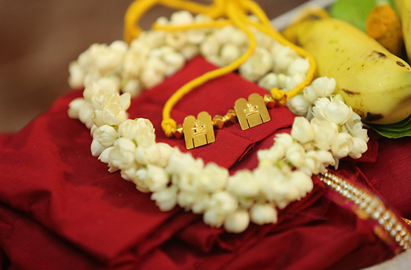 Before this important finale, koorai pudavai aseervatham is done. Koorai pudavai is the official attire for the bride to wear at the time of Muhurtham and it is generally in arakku colour. This sari is blessed by the priest and the bride leaves the stage for wearing it traditionally in the madisaar style. After the bride arrives with her koorai pudavai, the priest asks the groom to show the Mangalya set to the well wishers for their blessings. With shouts of “Getti Melam, Getti Melam”, the groom ties knot once and the sister of the groom ties the next two knots, to make it three. .At that time, the bride folds her hands and prays to the Almighty. Tears roll down from almost all the people present on the dias during this time