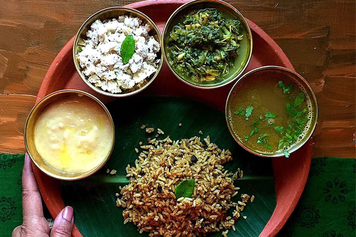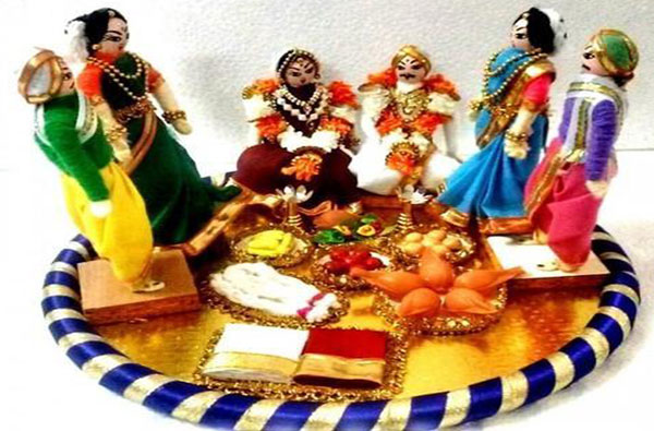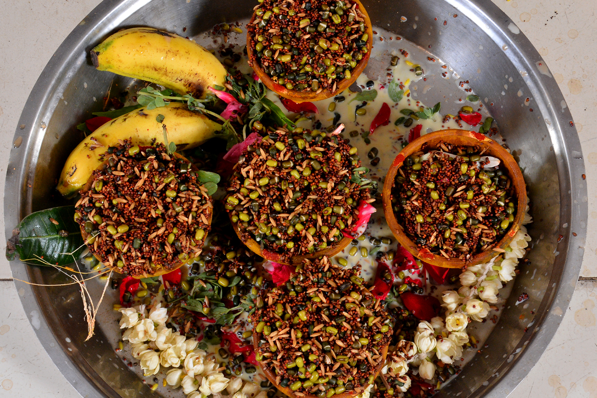 During this ritual, a clay pot filled with 5 varieties of grains is kept aside. The married women of the family pour water in the pot and allow the grains to sprout for the day. This is a symbolic ritual, where the pot is considered as house, grains as bride and groom and the sprouts indicate the prosperity in the family. The family members sing traditional religious songs during this ritual.