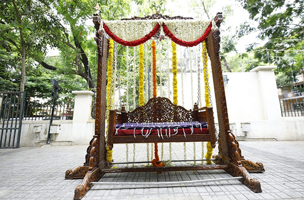 The bride and the groom are made to sit on a wooden plank swing with a pattu pai spread on it, where ladies of the house sing traditional folk songs and celebrate the holiness by first washing their legs with milk and wipe it off with the mundhi of their 9 yards saree. Then milk and fruit are offered in silver cups. Many of the close relatives to both the sides participate in this ritual. Multi coloured rice balls are thrown on all the four directions by the ladies, to drive away the evil forces. After this, the groom is asked to hold the right hand of the bride with his right hand and say a few mantras. Then the bride’s mother will hold the right hand of the groom with a coconut and vice versa and lead them to the marriage dias.